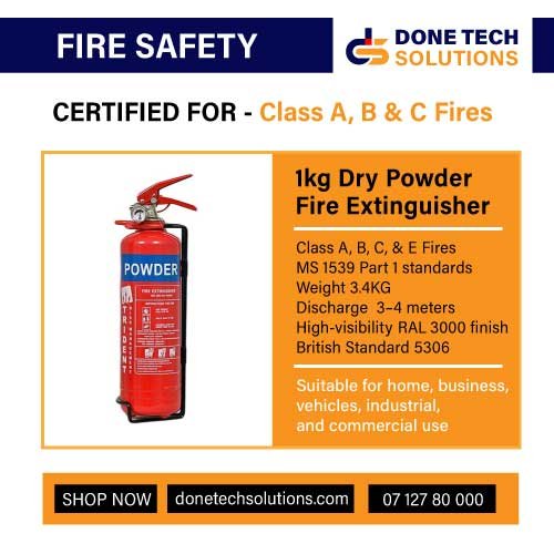 This 1kg Dry Powder Fire Extinguisher uses 40% monoammonium phosphate to stop fires fast and limit heat spread. As a result, flames are smothered early and damage stays controlled. The extinguisher releases powder at 14 bar for steady and accurate discharge, while testing at 25 bar ensures strength and safety. Moreover, it performs reliably across temperatures from minus 30 to plus 60 degrees Celsius, which suits Kenya’s changing conditions. However, the design excludes specialist metal fires. Overall, every feature supports consistent performance when fast response matters most.