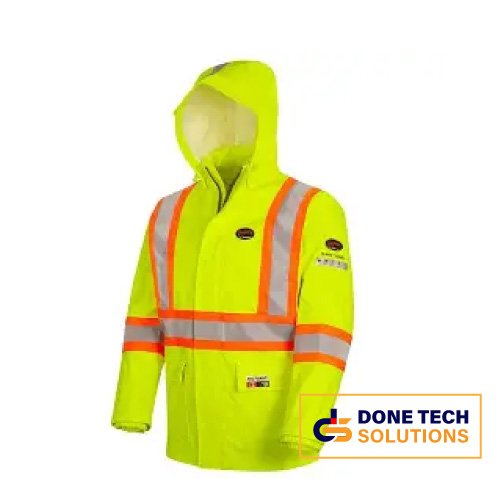 The  Rain Jacket includes 2-inch retro reflective tape for full visibility in dark environments. The reflective strips provide 360-degree reflective coverage. This feature helps workers remain visible from different directions.